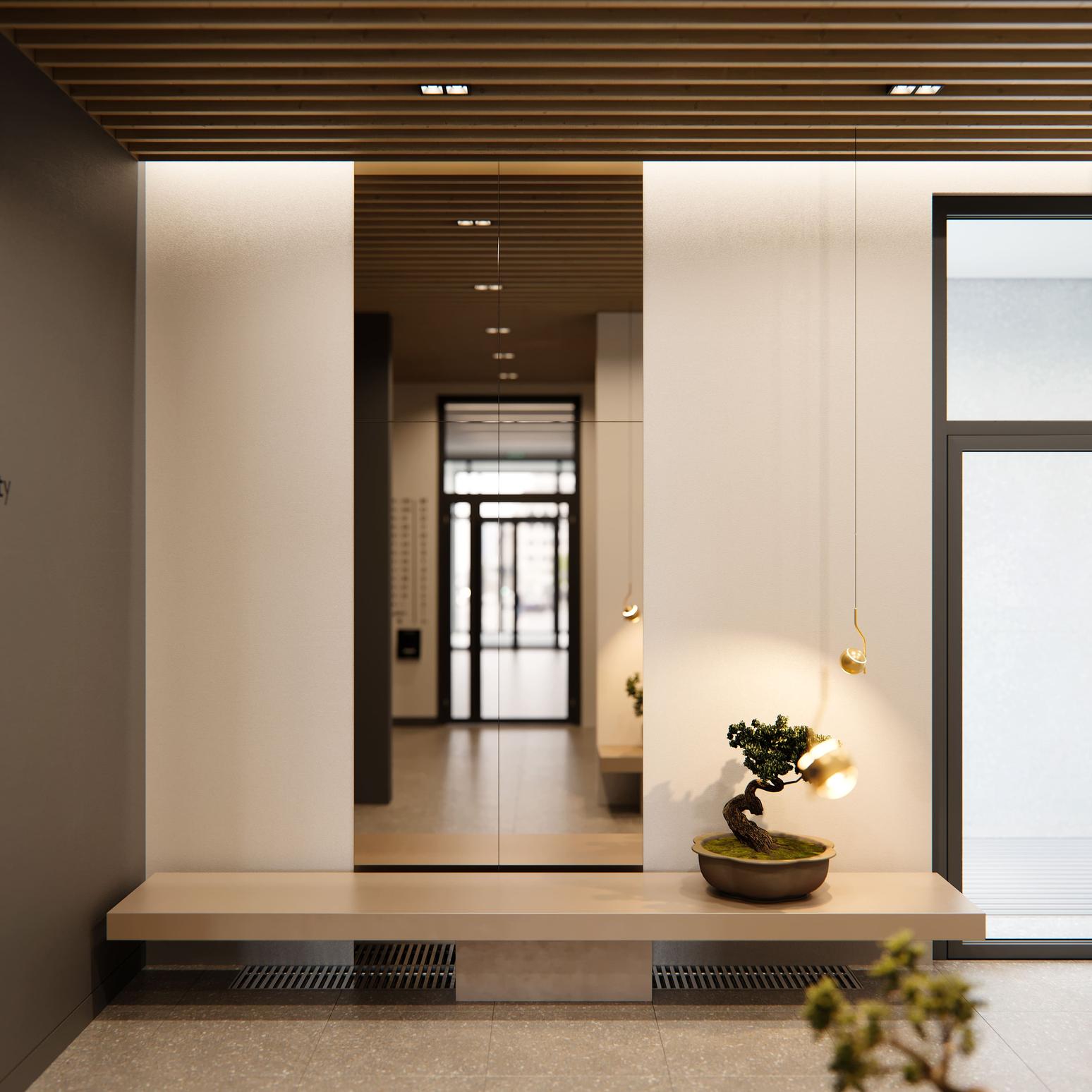 Стены лобби отделаны металлическими панелями, которые сочетаются с благородными оттенками серого, бежевого и коричневого цветов. Зеркала с бронзовым тонированием, зона для гостей с мягкой мебелью и многоуровневое освещение добавляют интерьерам выразительности, делая пространство не только стильным, но и уютным. Здесь приятно дождаться гостей, встретить курьера или разместиться для small talk с соседями.