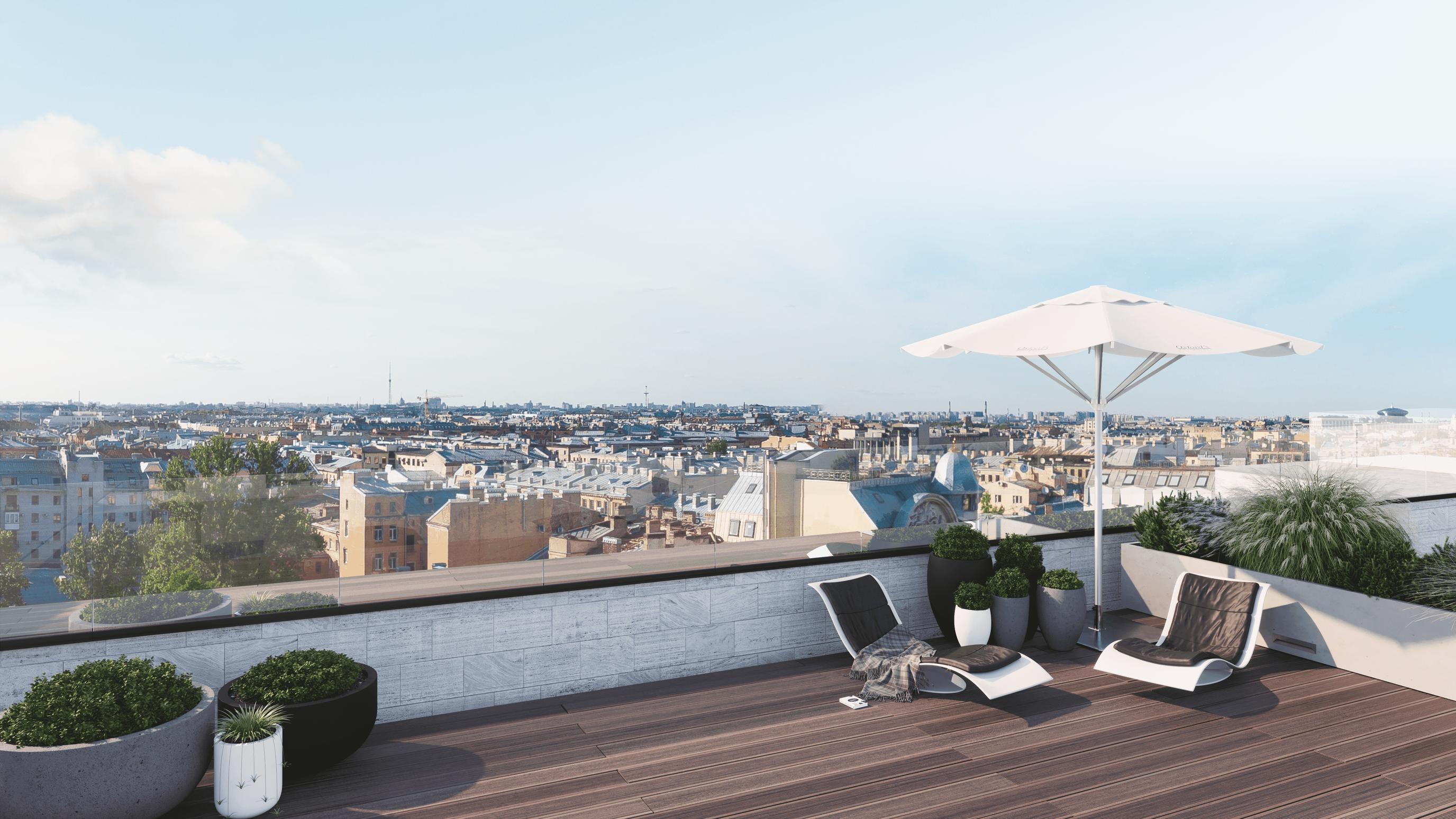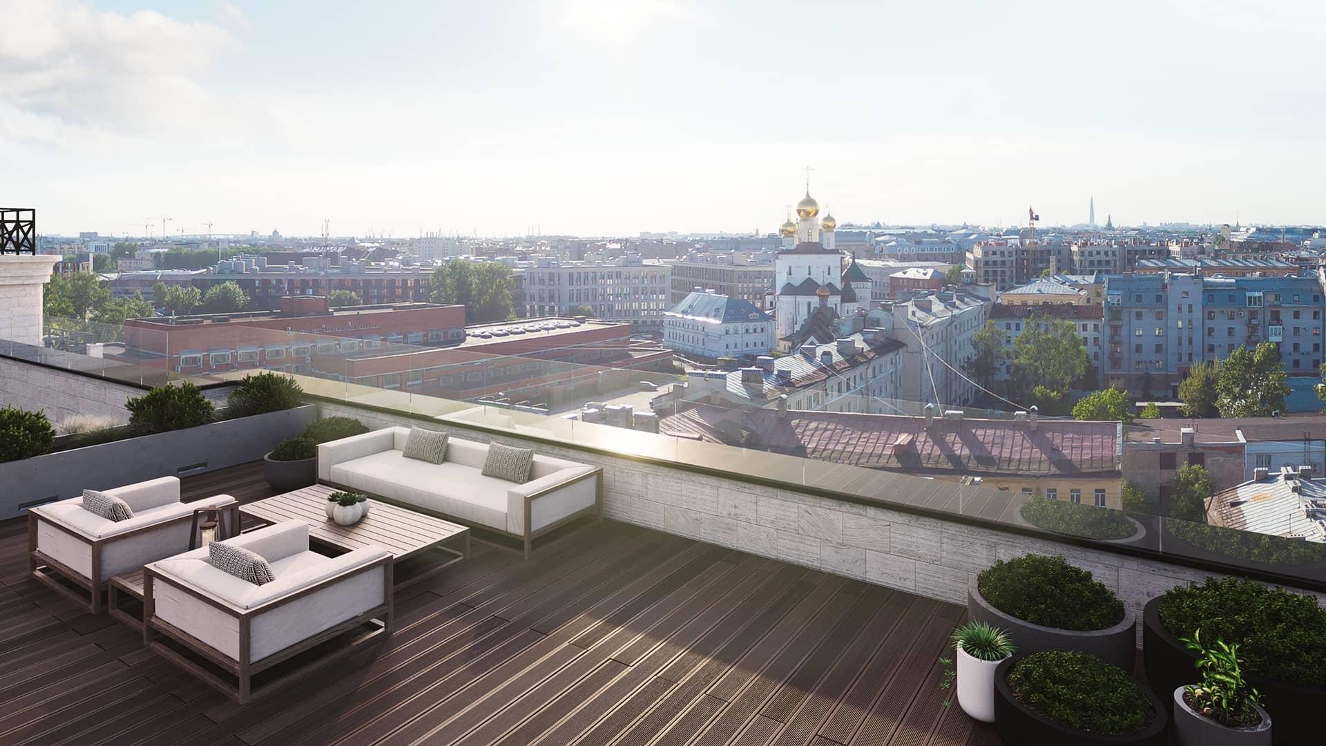 На крыше Grand House мы обустроили общую просторную террасу, откуда жителям дома и их гостям открывается восхитительный вид на ключевые доминанты Петербурга: Исаакиевский собор, Адмиралтейство, Лахта-центр.
