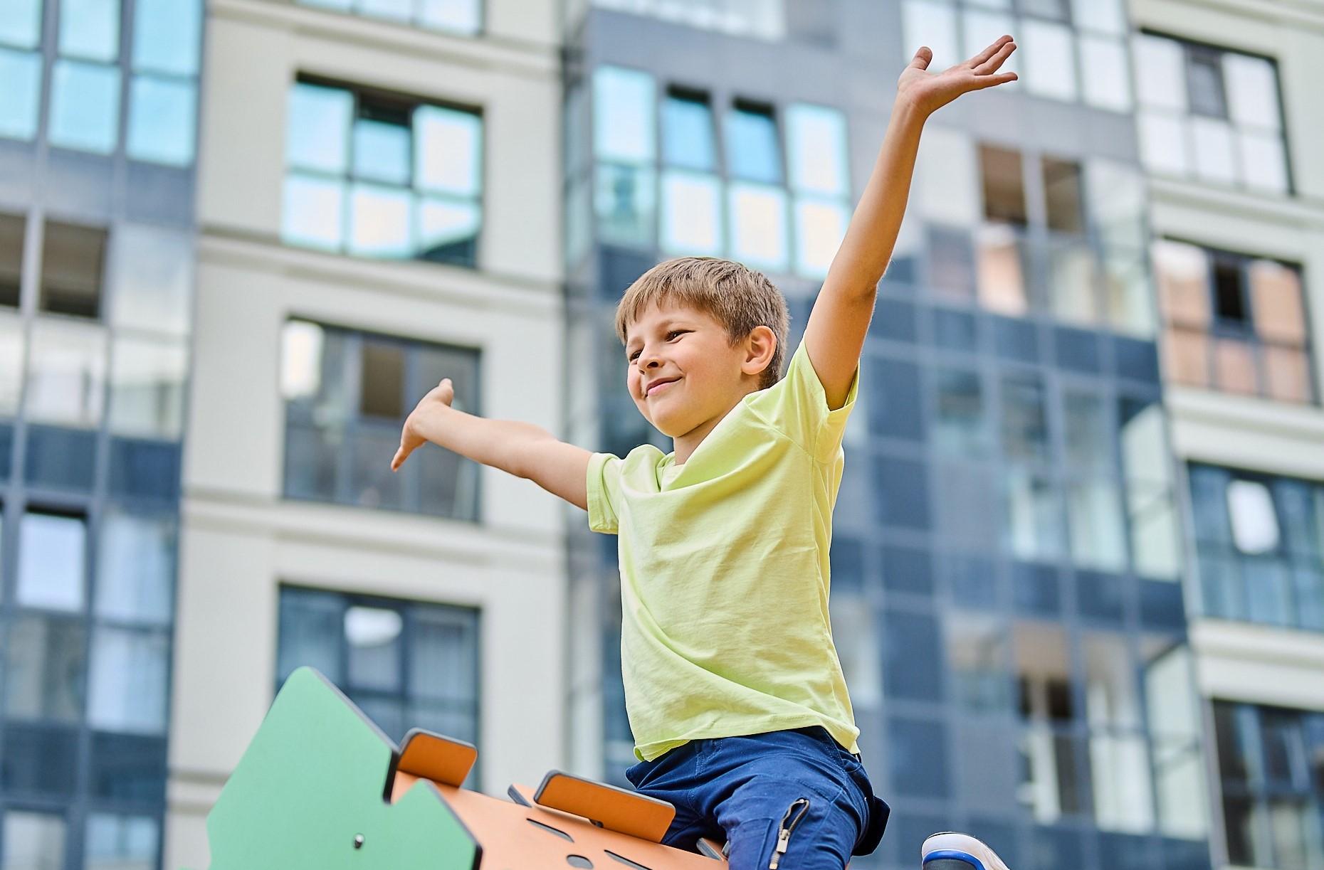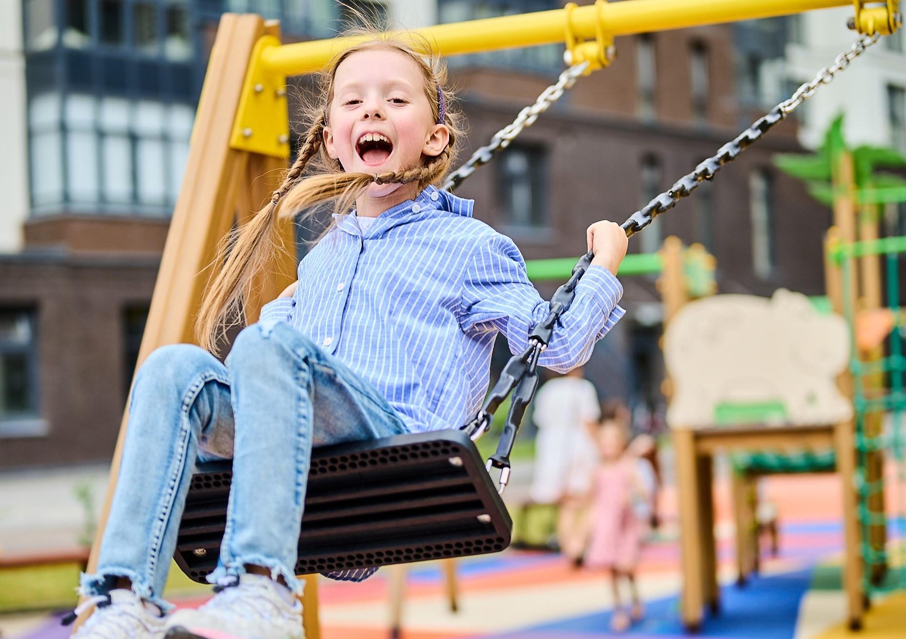Мы обустроили в «Первом квартале» пространства для детей разного возраста. Для малышей мы предусмотрели игровые площадки с маленькими горочками, качелями и песочницей.